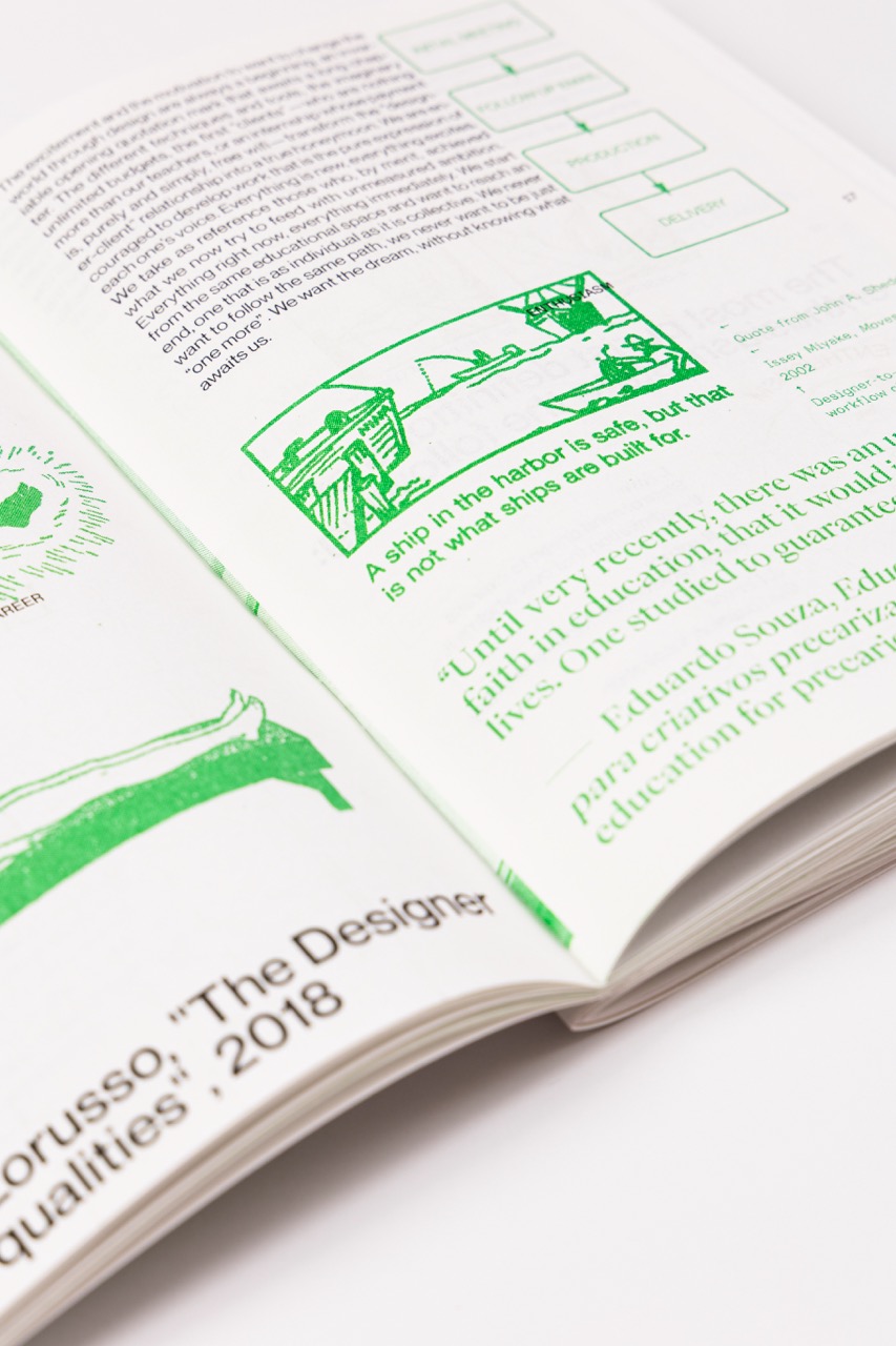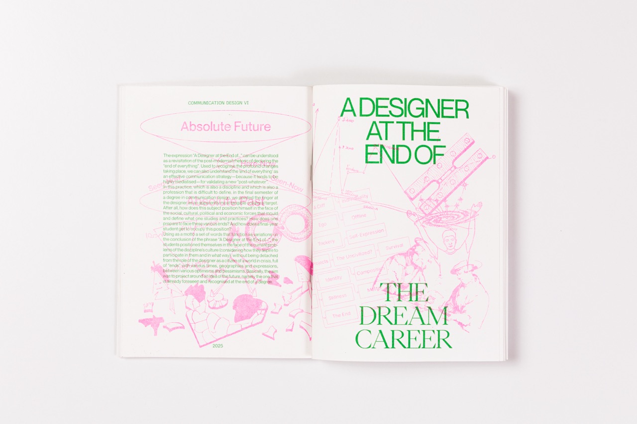 "A Designer at the End of the Dream Career" is a self-published book reflecting on the non-linear paths designers face as they begin their professional journeys. Developed in the final semester of the Communication Design degree, it explores the symbolic and practical weight of reaching the end of academic life.