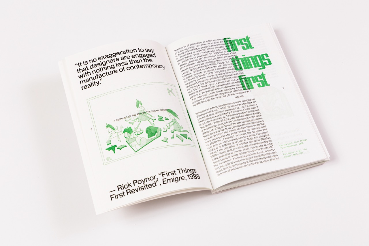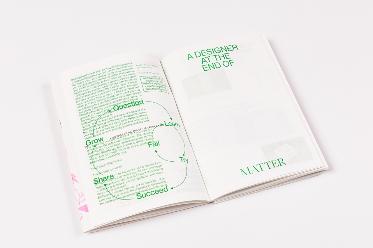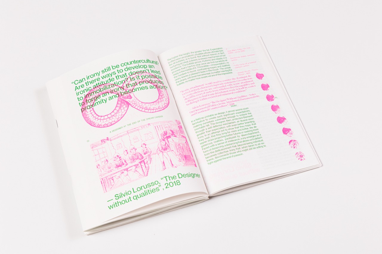 Printed with the faculty’s Risograph machine and fully produced by hand—folded, stapled, and trimmed in the design lab—it was released in a limited run of 100 copies, each with a distinct, tactile quality.