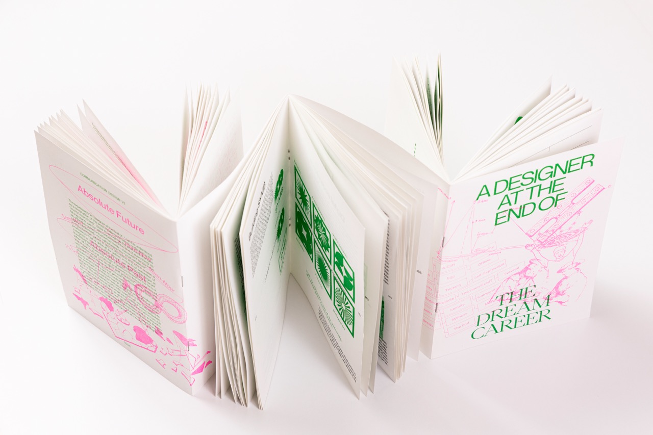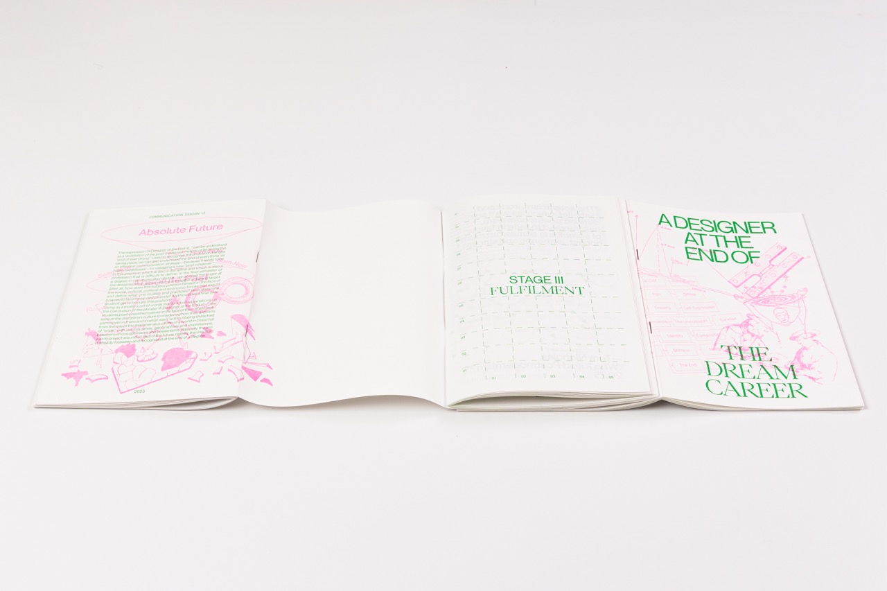 The project began with a prompt: “A Designer at the End of…”. Each group completed the phrase in their own way, contributing an 8-page chapter that expressed personal and collective reflections. The task was then to bring them together under a shared theme, The Dream Career: the thrill of starting out, the disillusionment that can follow, and the hope that keeps us moving forward.